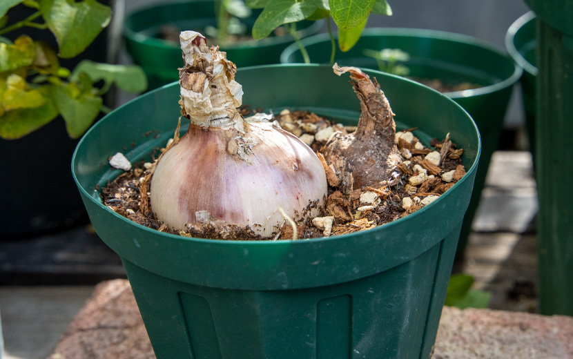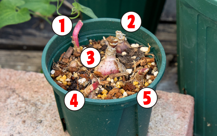 株分けしたてで、まだまだ小さい球根は3号鉢にまとめて植え付けてもOK。(写真のポットは兼弥産業のEU-10cm)