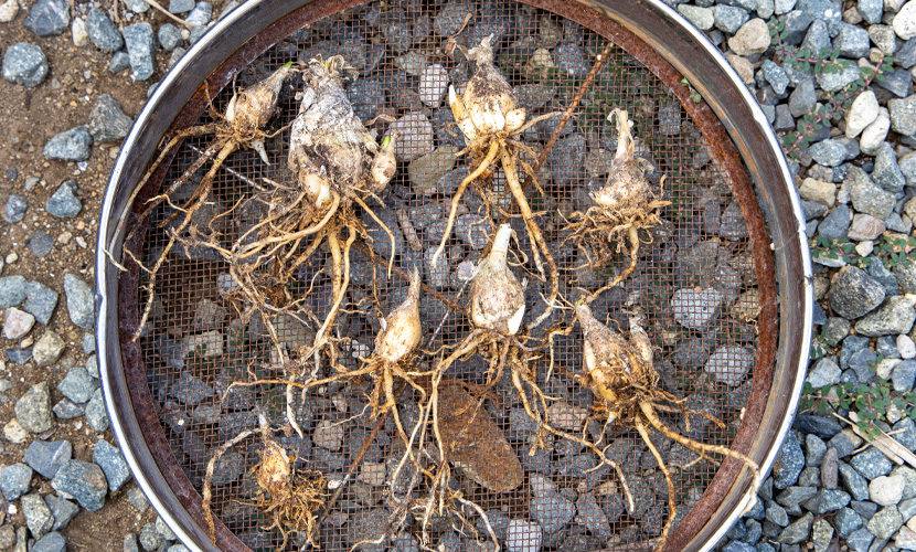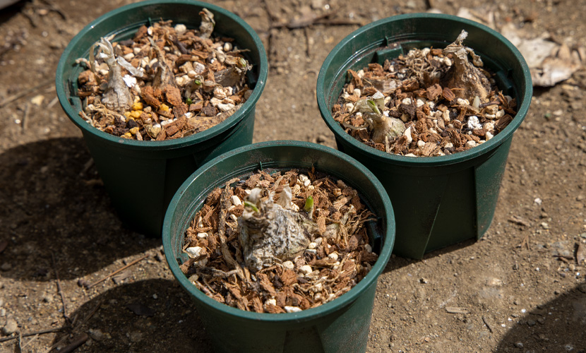 鉢が球根でいっぱいになったら、根を切らないよう丁寧に株分けし、再度植え直していきます。