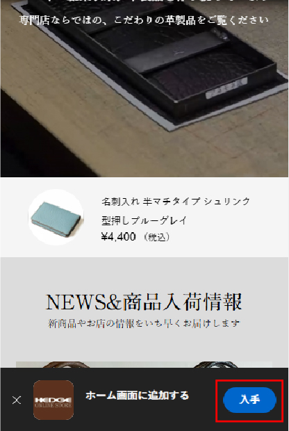 当サイトにアクセスいただくと画面の下部にホーム画面に追加の案内が表示されますので、そのまま「入手」をタップしてください。