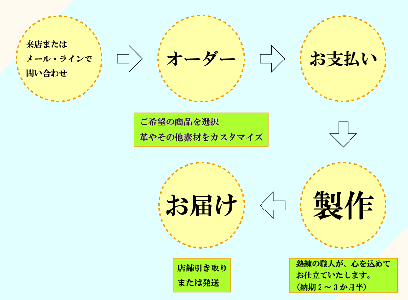 オーダーメイドの手順は、①来店またはオンラインからの問い合わせ→②ご希望の商品を選択し、革やステッチなどをカスタマイズ→③料金のお支払い→④その後職人が一つずつ丁寧に製作致します→⑤完成した製品を注文者様へお引渡し。