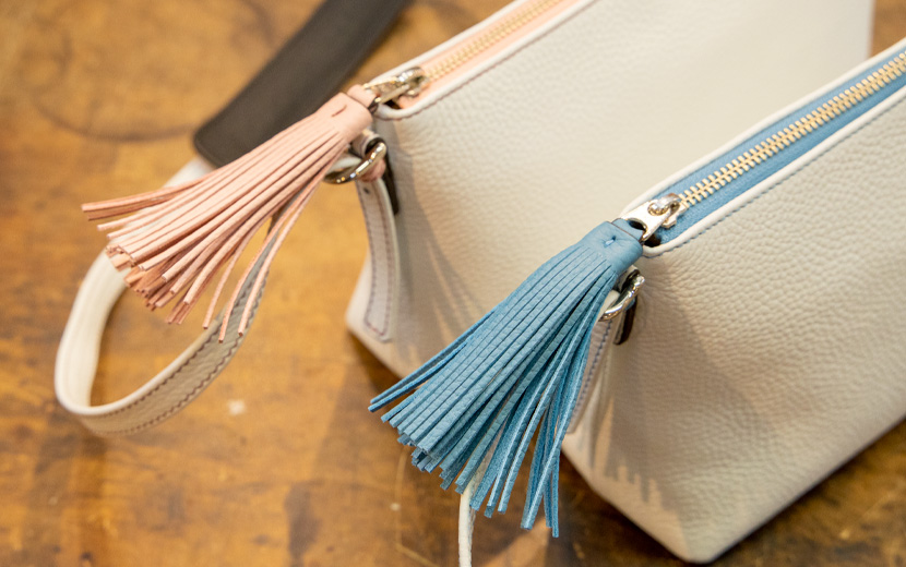 本体にはホワイトのシュリンク型押しを使用し、タッセルやファスナーなどの細かなパーツは、それぞれ淡いピンクと爽やかなスカイブルーを合わせたお揃いの仕上がり。